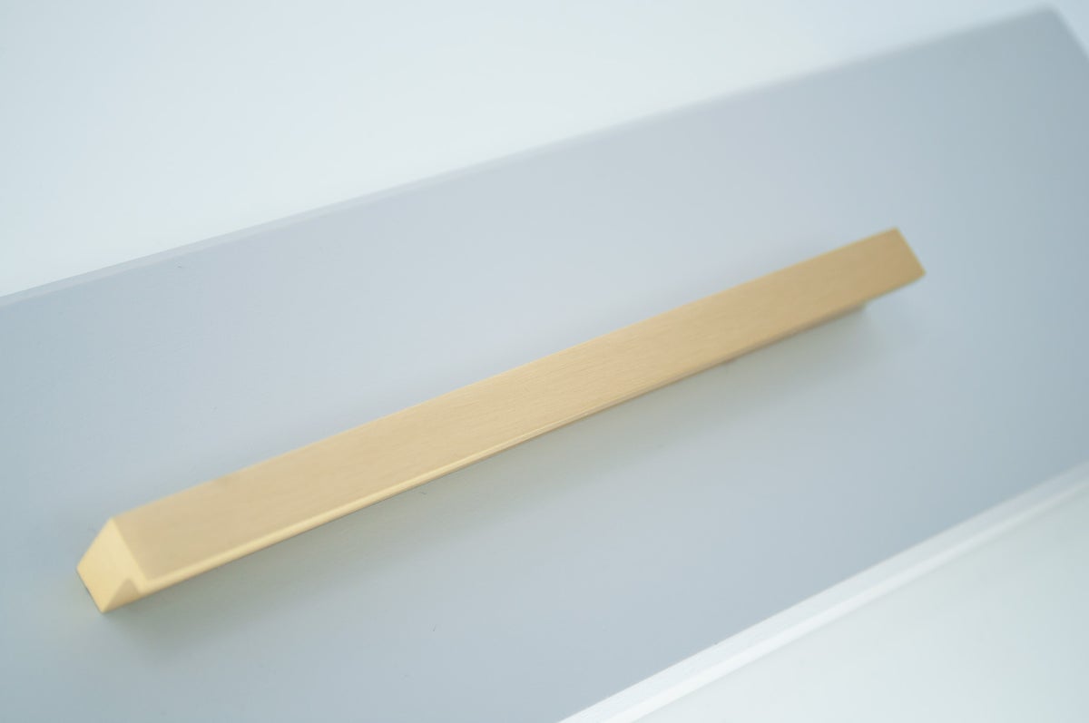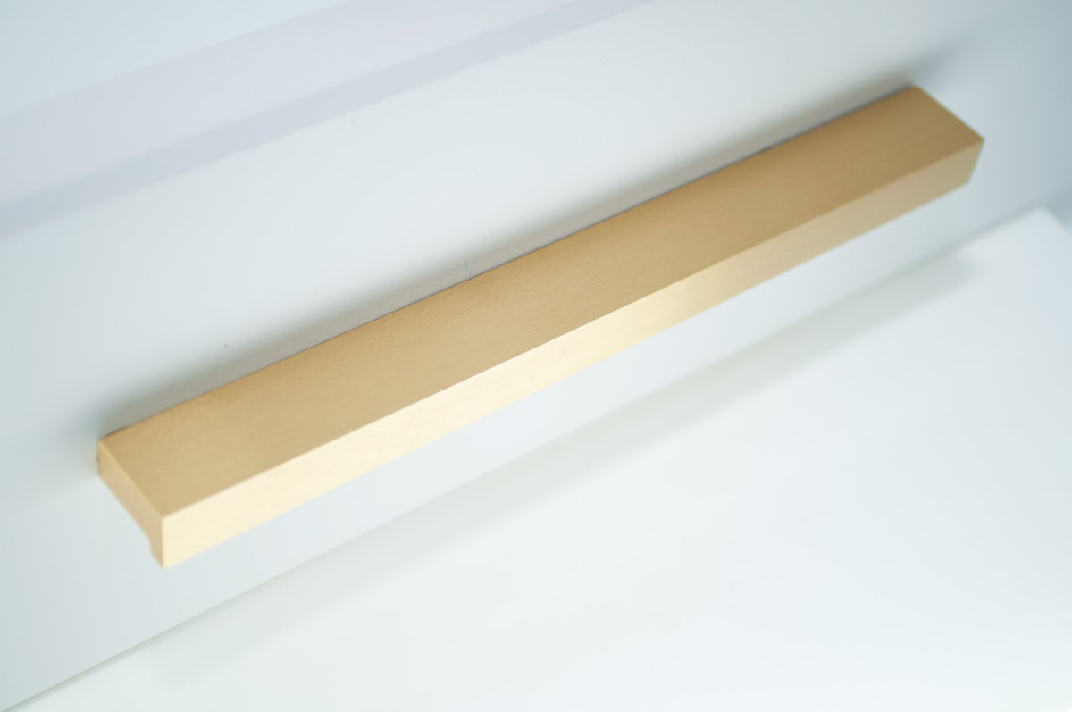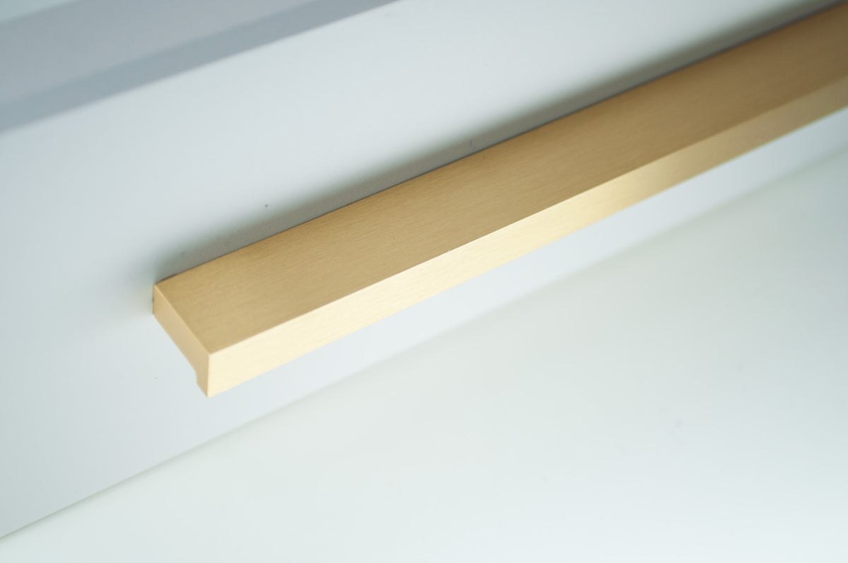 L-muotoinen, selkeälinjainen profiili luo kalusteisiin hienostuneen ja modernin ilmeen. Yksinkertainen muotoilu korostaa materiaalin kauneutta: lämmin messingin sävy ja harjattu pinta tuovat esiin messingin luonnollisen hohteen ilman liiallista kiiltoa.
